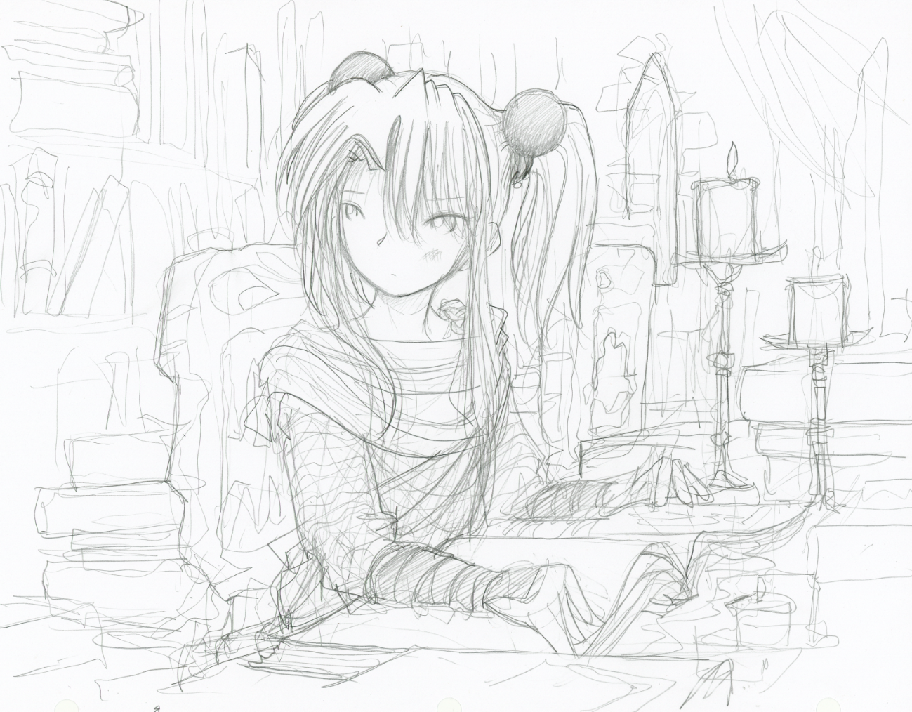 Young Pirogoeth, in her early years of training, some sketching and illustration dev work for a forthcoming light novel (more on that later) note that she seems to be sitting pretty high at that table for such a petite thing… well, she’s sitting on a bunch of books. ^^;; Rough, random sketch i probably will cringe when i look at tomorrow.
