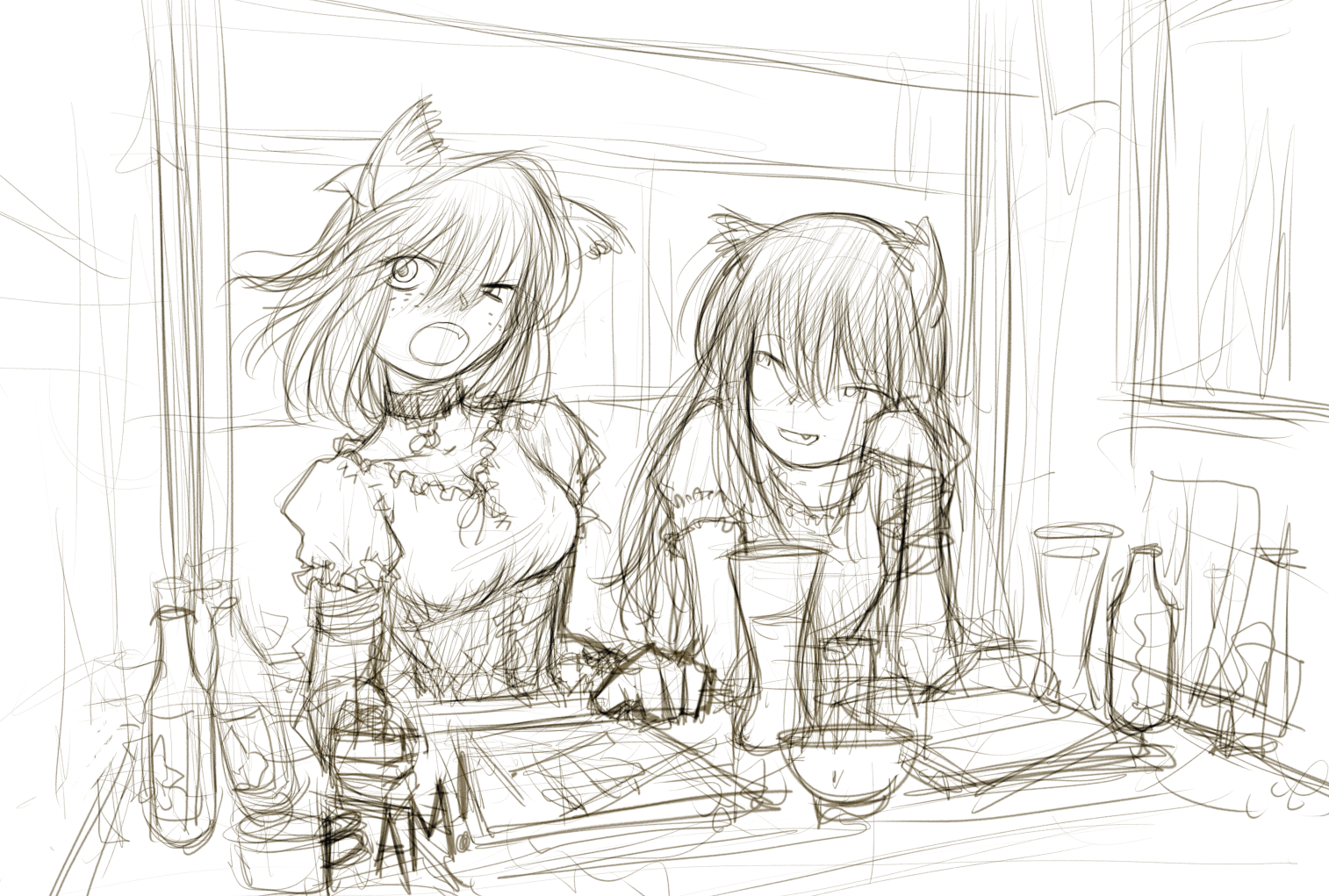 You walk into a small restaurant in tokyo and find yourself loudly chewed out by a fox girl and a wolf girl who have been drinking too much… (yes, this is actually a sketch from the Megatokyo Visual Novel. )